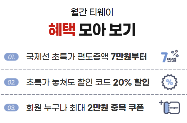프로모션 기간 동안 ‘월간 티웨이’ 결제를 통해 최대 2만원 할인 쿠폰을 제공하며, 사전 좌석 지정 무료, 여정 변경 수수료 무료 등의 혜택을 받을 수 있습니다.