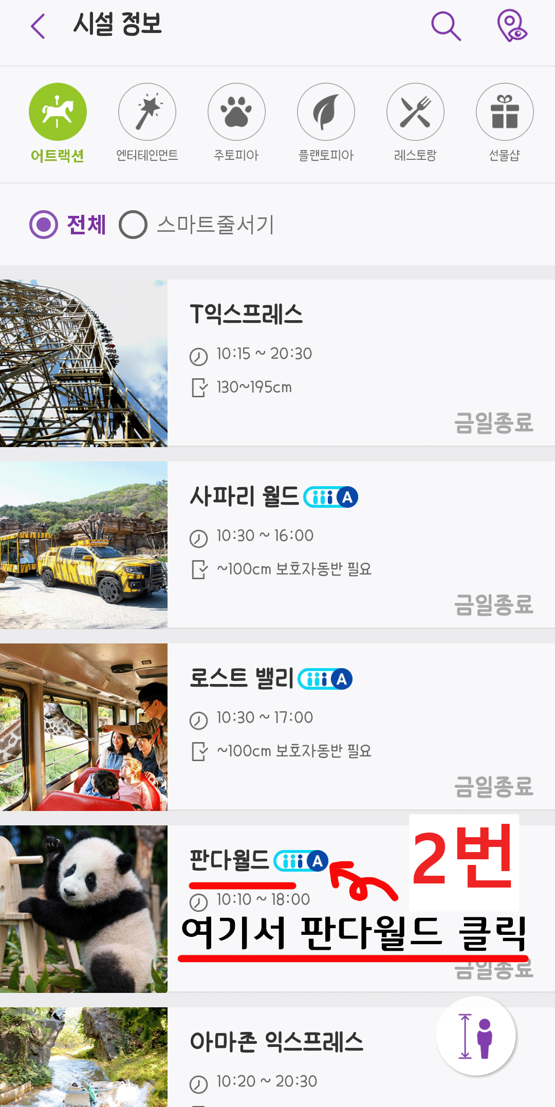 또한, 에버랜드 방문 시 스마트 줄 서기는 판다월드만 가실 경우에는 상관없겠지만, 다른 사파리 월드나 익스프레스, 등 놀이기구 이용 시 다중 선택이 안됩니다.