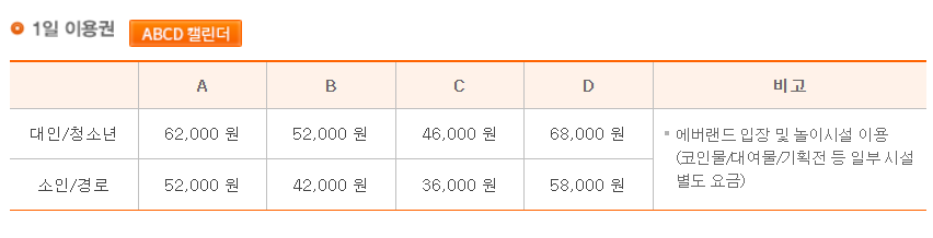 에버랜드 자유 이용권은 평일, 주말, 공휴일에 따라서 많은 가격 차이가 납니다. 에버랜드 공식 홈페이지를 살펴보시면 어린이, 청소년, 어른에 따라 가격이 다릅니다. 해당 가격표에 ABCD캘린더를 참고하시면 됩니다.