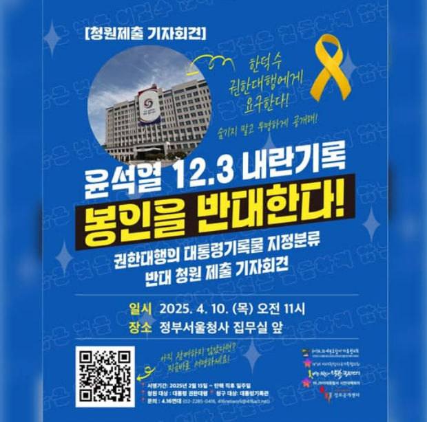 하지만 아직 부족합니다. 이미 세월호 참사 유가족들, 이태원 참사 유가족들, 정보공개 활동가들이 분노와 절망 속에서도 다시 거리로 나섰습니다. 그리고 2025년 4월 10일, 정부서울청사 앞에서 '윤석열 12.3 내란기록 봉인 반대' 기자회견이 열렸습니다.