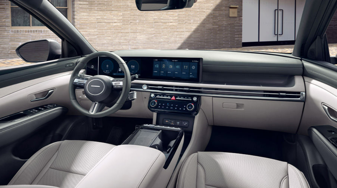 신형 투싼의 전면부는 날개 형상을 한 주간주행등그릴이 이전 모델보다 얇고 각진 형태로 변경되었습니다.  내부에는 12.3인치 디지털 클러스터 등을 곡선 형태로 연결한 '파노라믹 커브드' 디스플레이가 탑재되었습니다.