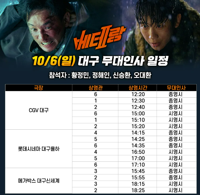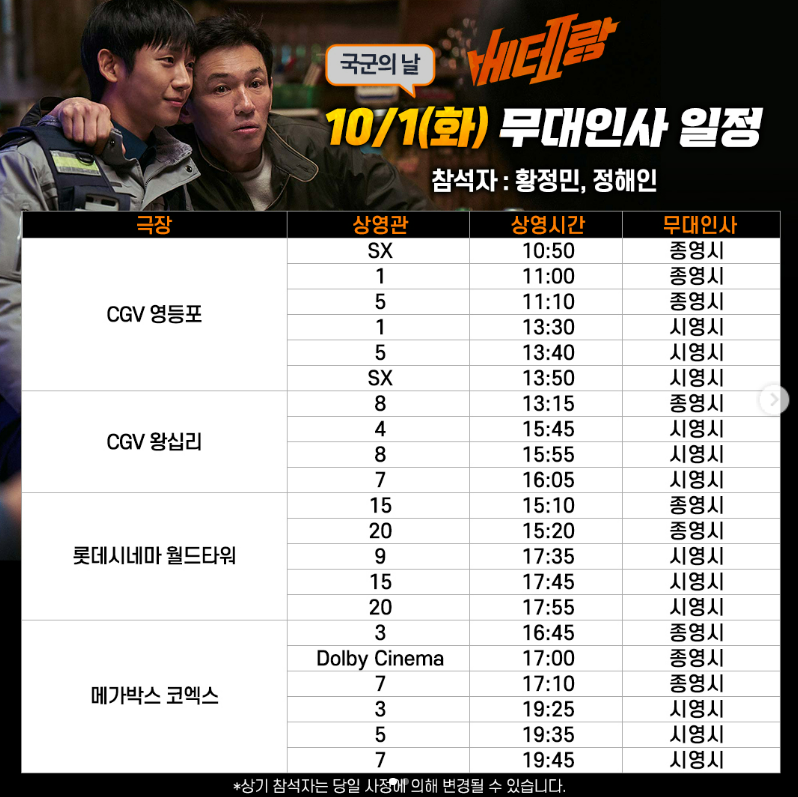 현재, 베테랑2 흥행속도가 빨라짐에 따라 무대인사 전국일정이 더 활발해지고 있습니다. 서울지역 뿐만 아니라 인천, 부산, 대구 지역에서 내가 보고싶었던 배우들을 직접 만날 기회라 많은 팬들이 기대를 하고 있는 상황입니다. 아래 무대일정표를 확인하시고, 빠른 예매로 성공하시길 바랍니다.