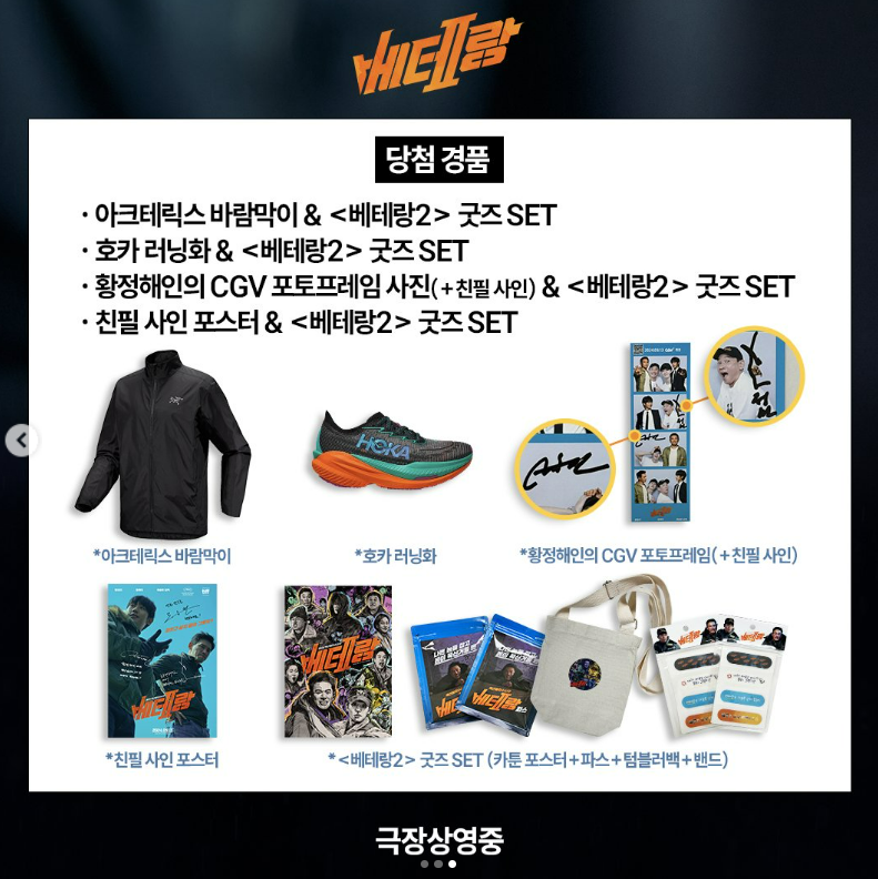 "베테랑 2" 무대인사에 참여하시면, 다양한 경품 이벤트도 함께 즐기실 수 있습니다. 각 극장에서는 영화 관람 후 인증 시 포토카드, 아트 카드, 스페셜 포스터 등 다양한 경품을 증정합니다. CGV, 롯데시네마, 메가박스에서 제공하는 특별한 굿즈를 받으실 수 있으니, 무대인사뿐만 아니라 경품 혜택도 함께 누리세요!