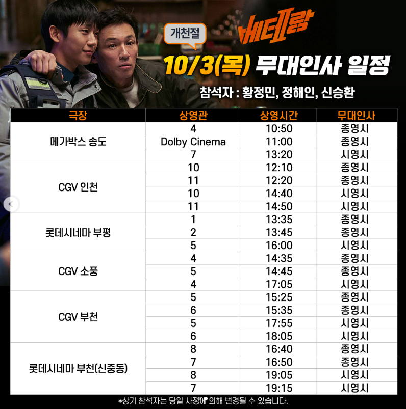 현재, 베테랑2 흥행속도가 빨라짐에 따라 무대인사 전국일정이 더 활발해지고 있습니다. 서울지역 뿐만 아니라 인천, 부산, 대구 지역에서 내가 보고싶었던 배우들을 직접 만날 기회라 많은 팬들이 기대를 하고 있는 상황입니다. 아래 무대일정표를 확인하시고, 빠른 예매로 성공하시길 바랍니다.