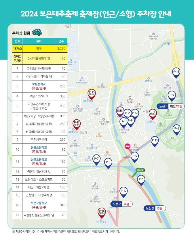 - 주요 주차장: 삼산체육관 앞, 보은초등학교, 보은공설운동장 등