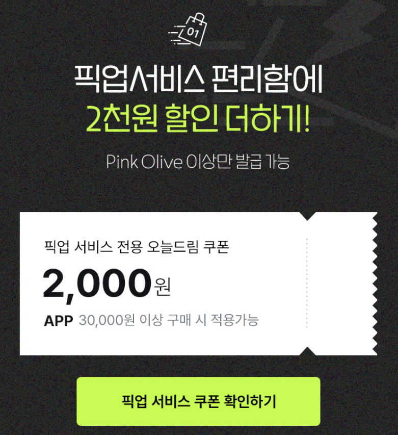 - 픽업 서비스 전용 쿠폰을 사용하면 30,000원 이상 구매 시 2,000원의 추가 할인을 받을 수 있어 더욱 유리합니다.