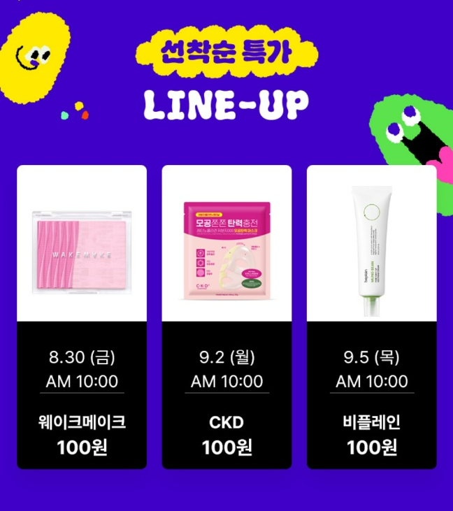 ✅ 8월 30일 (금) AM 10:00 웨이크메이크: 인기 있는 메이크업 제품을 단돈 100원에 구매할 수 있는 기회입니다. 오픈런 준비 필수!
