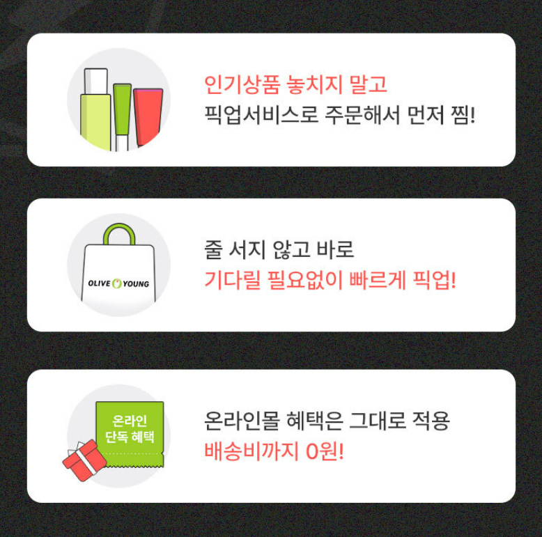 - 오늘드림 픽업 서비스: 온라인에서 구매한 상품을 가까운 매장에서 바로 픽업할 수 있는 오늘드림 픽업 서비스를 활용해 보세요. 배송을 기다릴 필요 없이, 원하는 시간에 편리하게 상품을 수령할 수 있습니다.