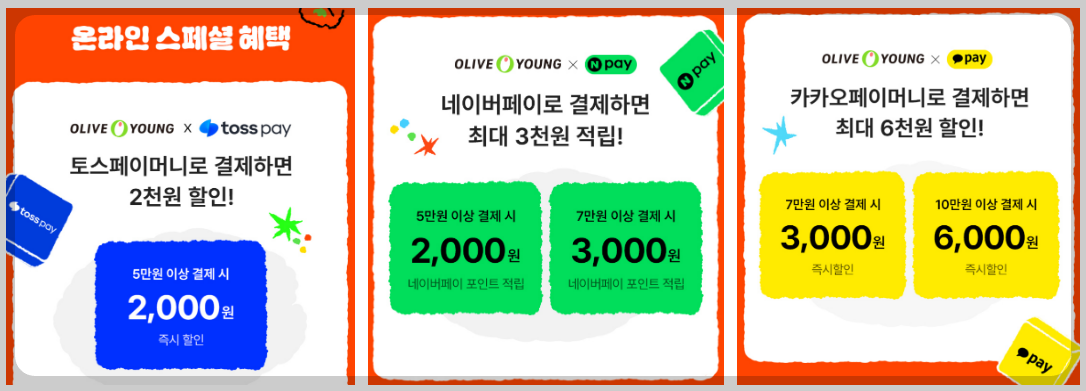 - 카카오페이머니 할인: 카카오페이머니로 7만 원 이상 결제 시 3,000원, 10만 원 이상 결제 시 6,000원의 할인을 즉시 적용 받을 수 있습니다. 카카오페이를 사용하신다면, 이 기회를 놓치지 마세요.