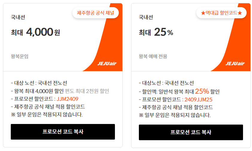 - 국내선 왕복 예매 전용 할인코드: 최대 25% 할인