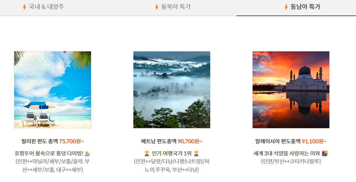 | 필리핀 | 75,700원~ | 인천/부산↔세부/보홀 등 |