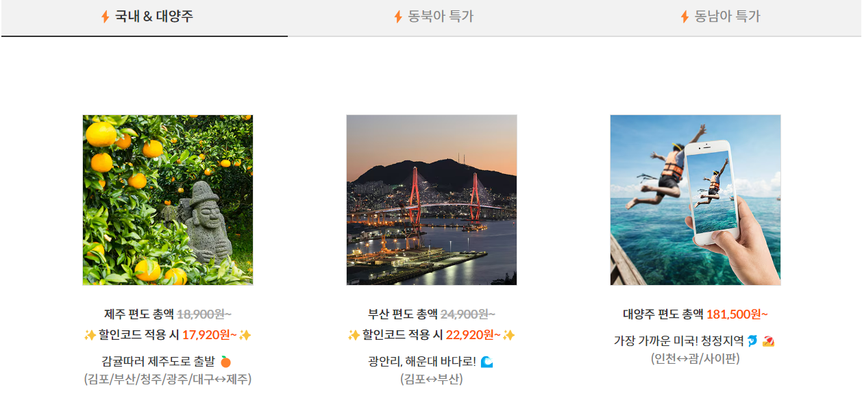 | 제주 | 18,900원~ (할인코드 적용 시 17,920원~) | 제주행 항공권 |