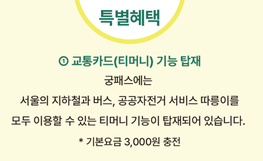 - 궁패스에는 서울의 지하철, 버스, 공공자전거 따릉이를 이용할 수 있는 티머니 기능이 포함되어 있습니다. 기본요금 3,000원이 충전된 상태로 제공되므로, 교통이 더욱 편리해집니다.