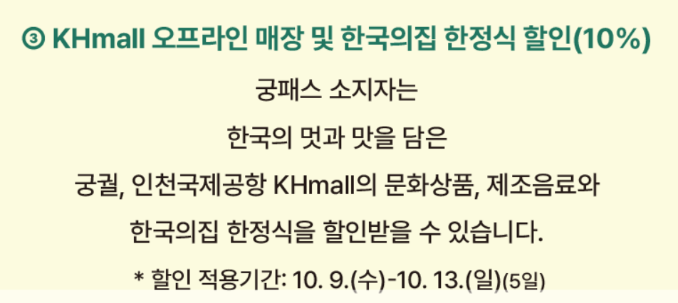 - 궁패스 소지자는 인천국제공항의 KHmall 매장에서 전통문화상품 및 음료를 할인받을 수 있으며, 한국의집 한정식도 10% 할인 혜택을 받을 수 있습니다.
