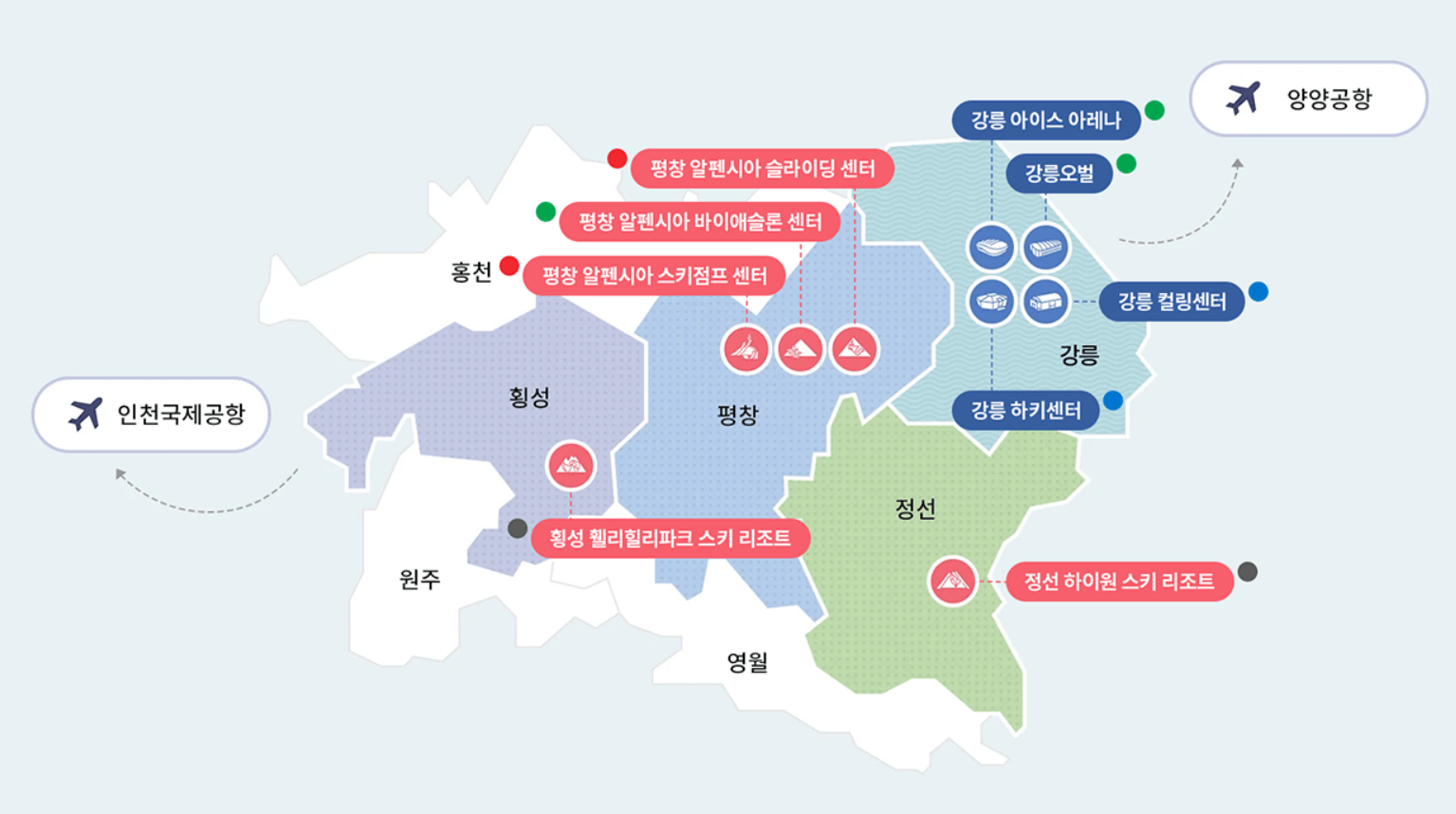 강원 동계 청소년 올림픽 대회를 관람하기 위해 방문을 하실 예정이라면 경기장 장소도 미리 파악해 두시는 것이 좋겠죠? 경기마다 경기장 장소가 다르니 아래 강원 동계 올림픽 경기장 지도를 참고해 주시길 바랍니다.