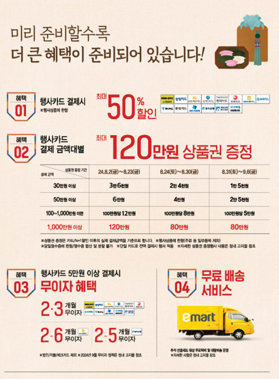 행사 카드로 5만원 이상 결제 시, 2~6개월 무이자 할부 혜택을 받을 수 있습니다. 이는 선물 준비에 있어 부담을 덜어주는 중요한 혜택입니다. - 무료 배송 서비스