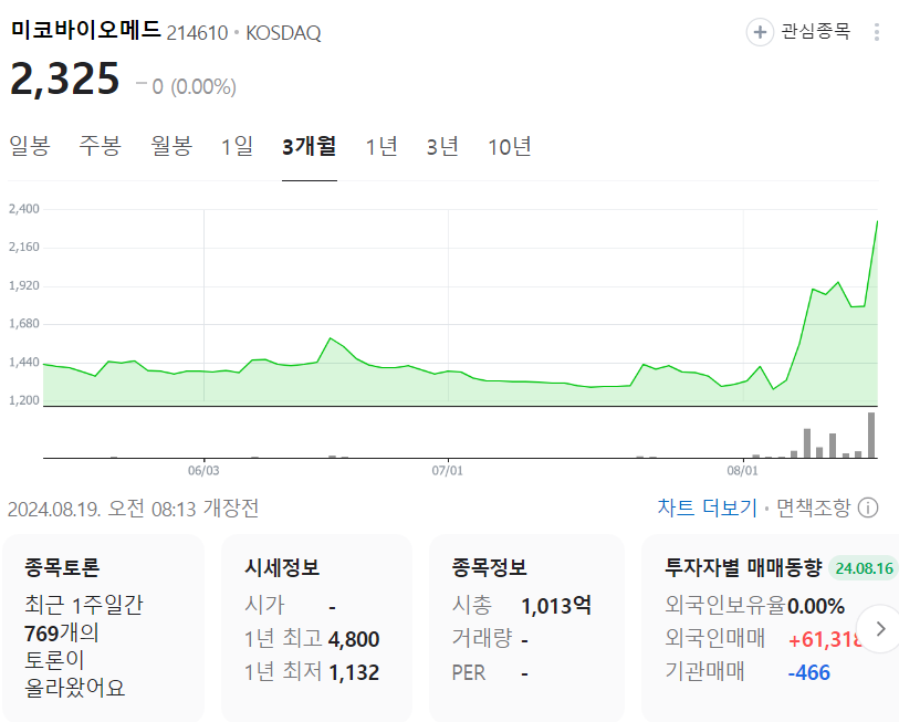 분자 진단장비 및 키트 개발: 미코바이오메드는 코로나19와 같은 감염병을 진단할 수 있는 분자 진단장비와 키트를 개발하는 회사입니다. 국내외 시장에 활발히 제품을 공급하고 있으며, 최근 코로나19 재유행과 엠폭스 확산 소식에 주가가 29.74% 급등했습니다. 특히 새로운 감염병에 대한 경계가 높아지면서 이 회사의 제품 수요도 증가할 것으로 예상됩니다.