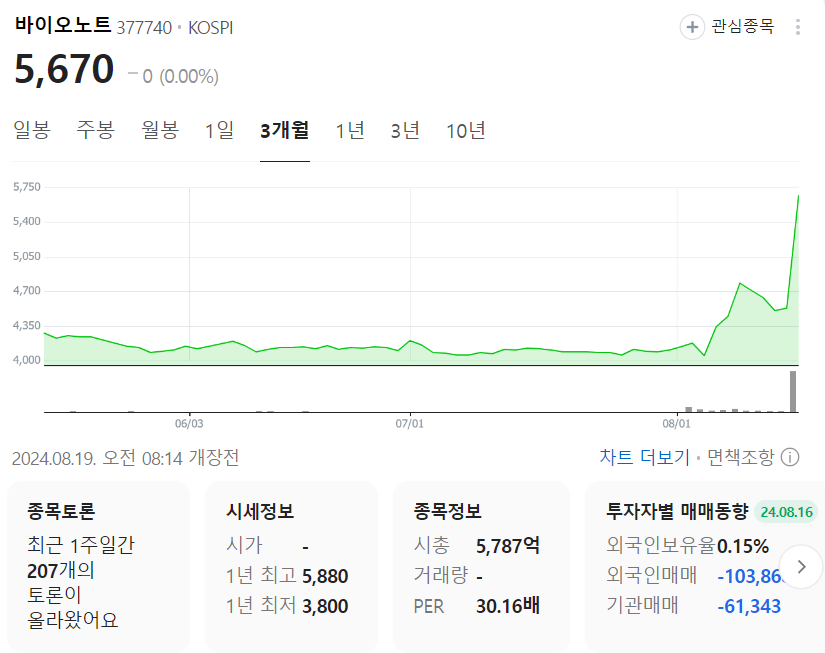 동물용 진단 검사 제품 판매: 바이오노트는 동물용 진단 검사 제품을 판매하는 회사로, 코로나19와 엠폭스 확산에 따라 주목받고 있습니다. 특히 동물에서 발생할 수 있는 바이러스를 진단할 수 있는 제품을 개발하고 있어, 감염병 확산이 계속될 경우 더 많은 관심을 받을 것으로 보입니다. 최근 주가가 25.17% 상승했습니다.