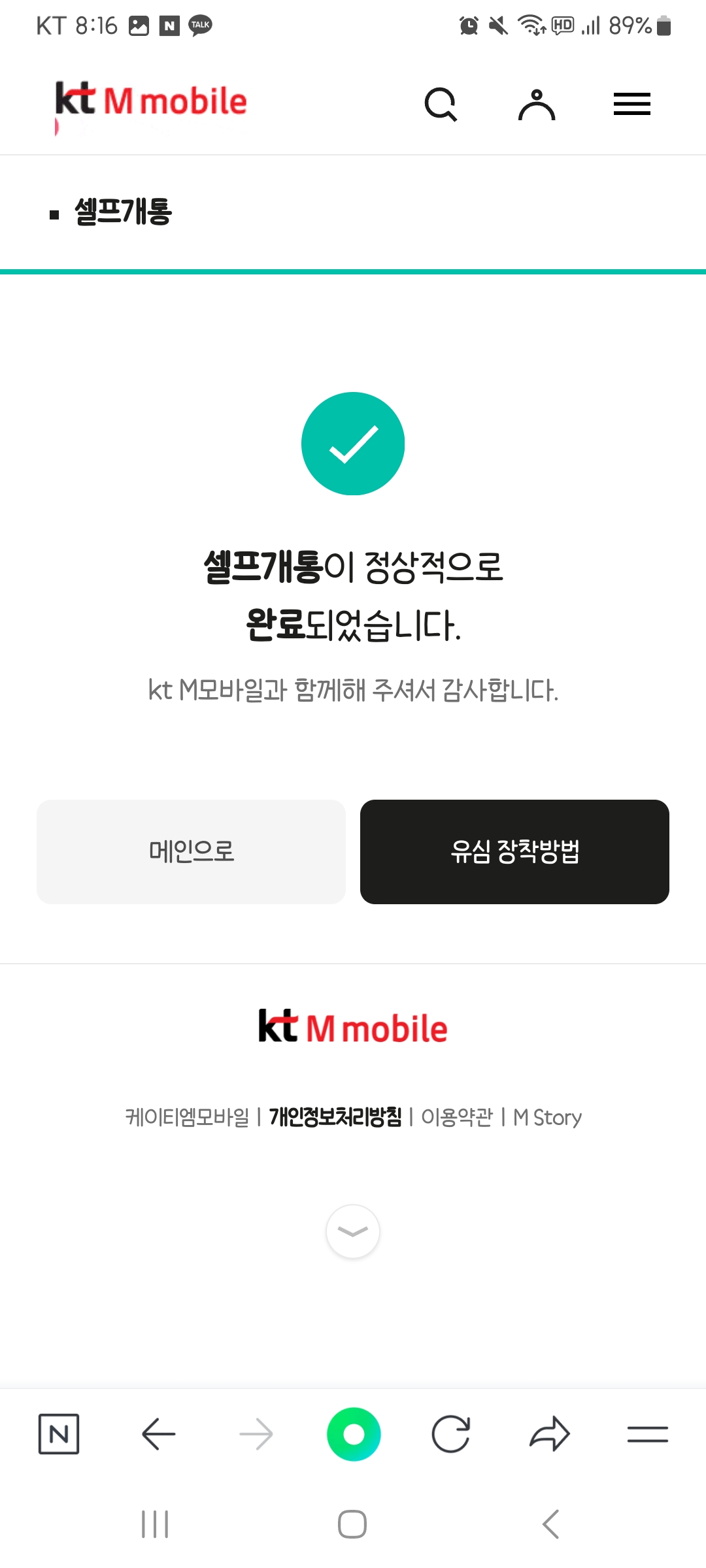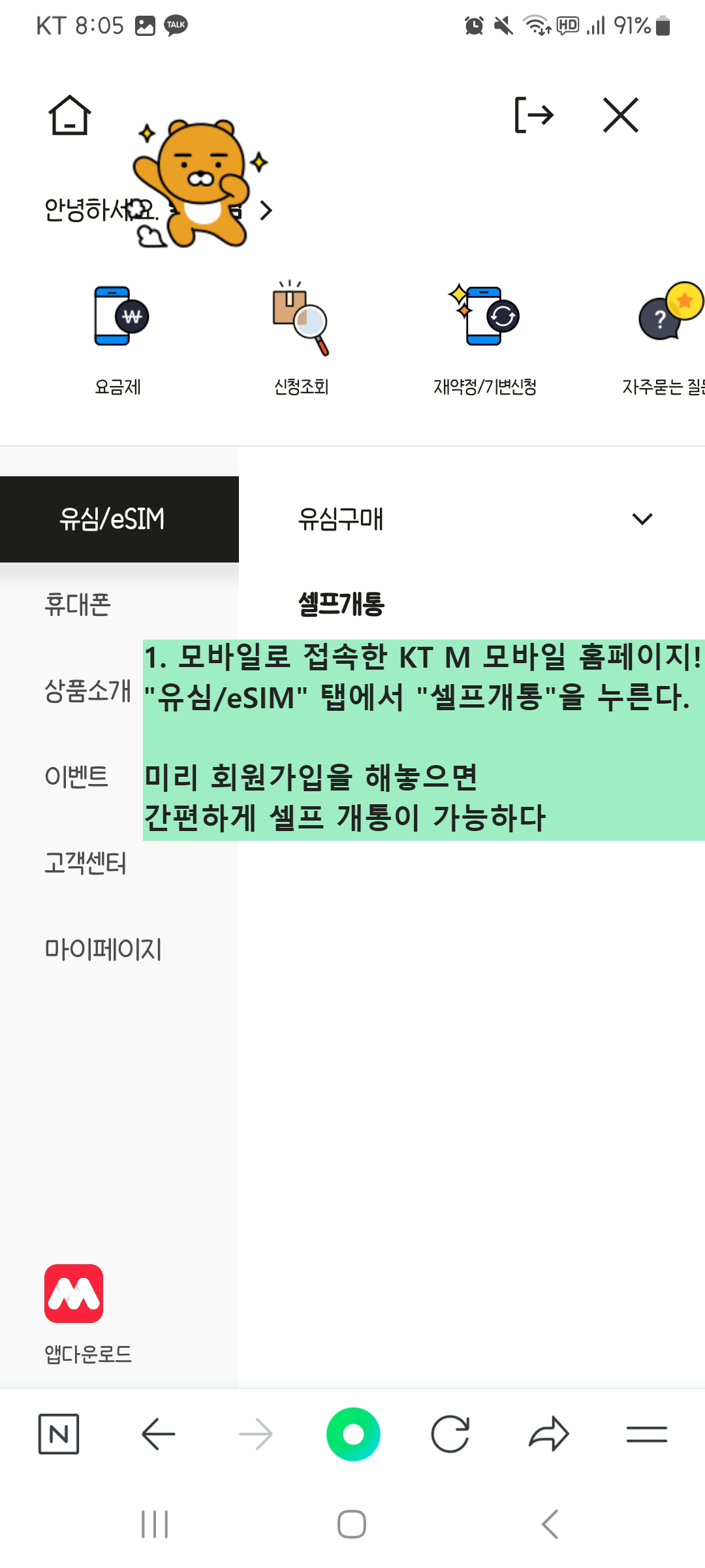 또한, 컴퓨터 PC가 아닌 지금 가지고 계신 스마트폰으로도 바로 가입이 가능합니다. 제가 직접 모바일 화면으로 알뜰폰 KT M모바일에 접속해서 홈페이지에서 제공하는 셀프 개통 간편 영상들을 시청을 한 뒤 바로 5분 만에 간편하게 가입하였습니다.